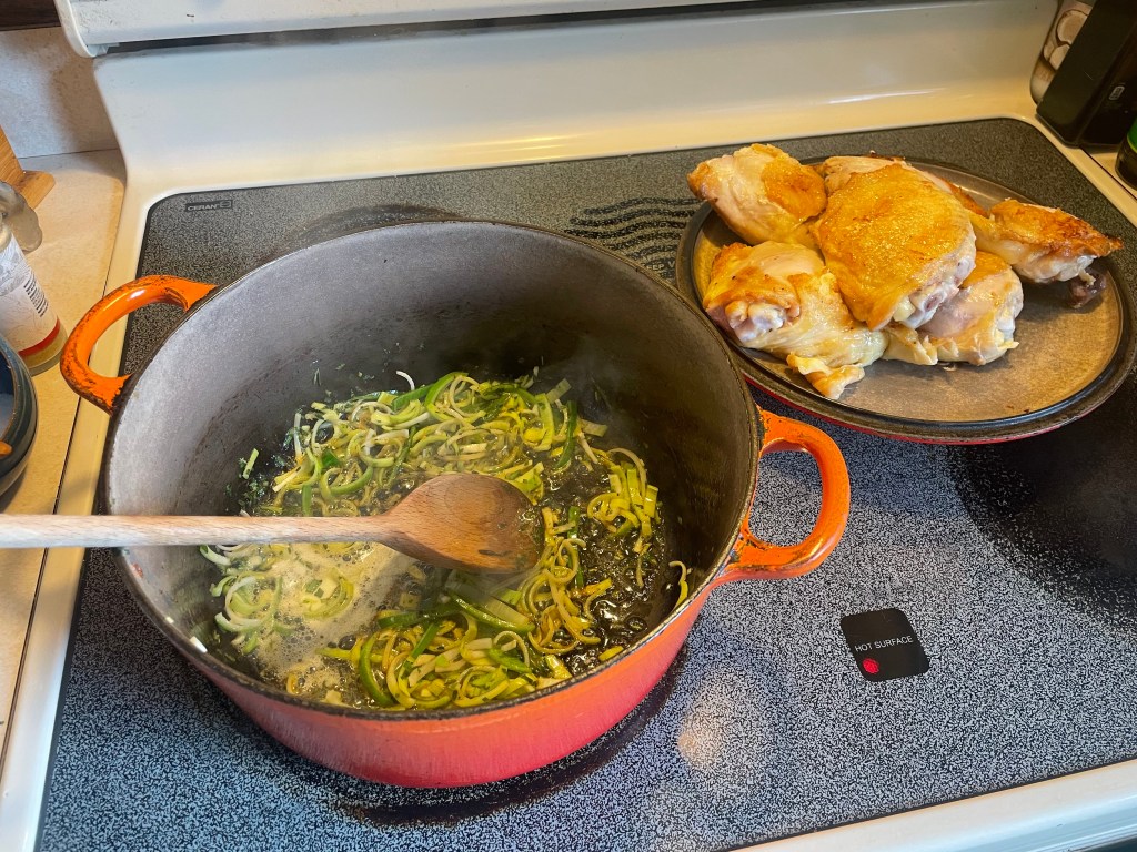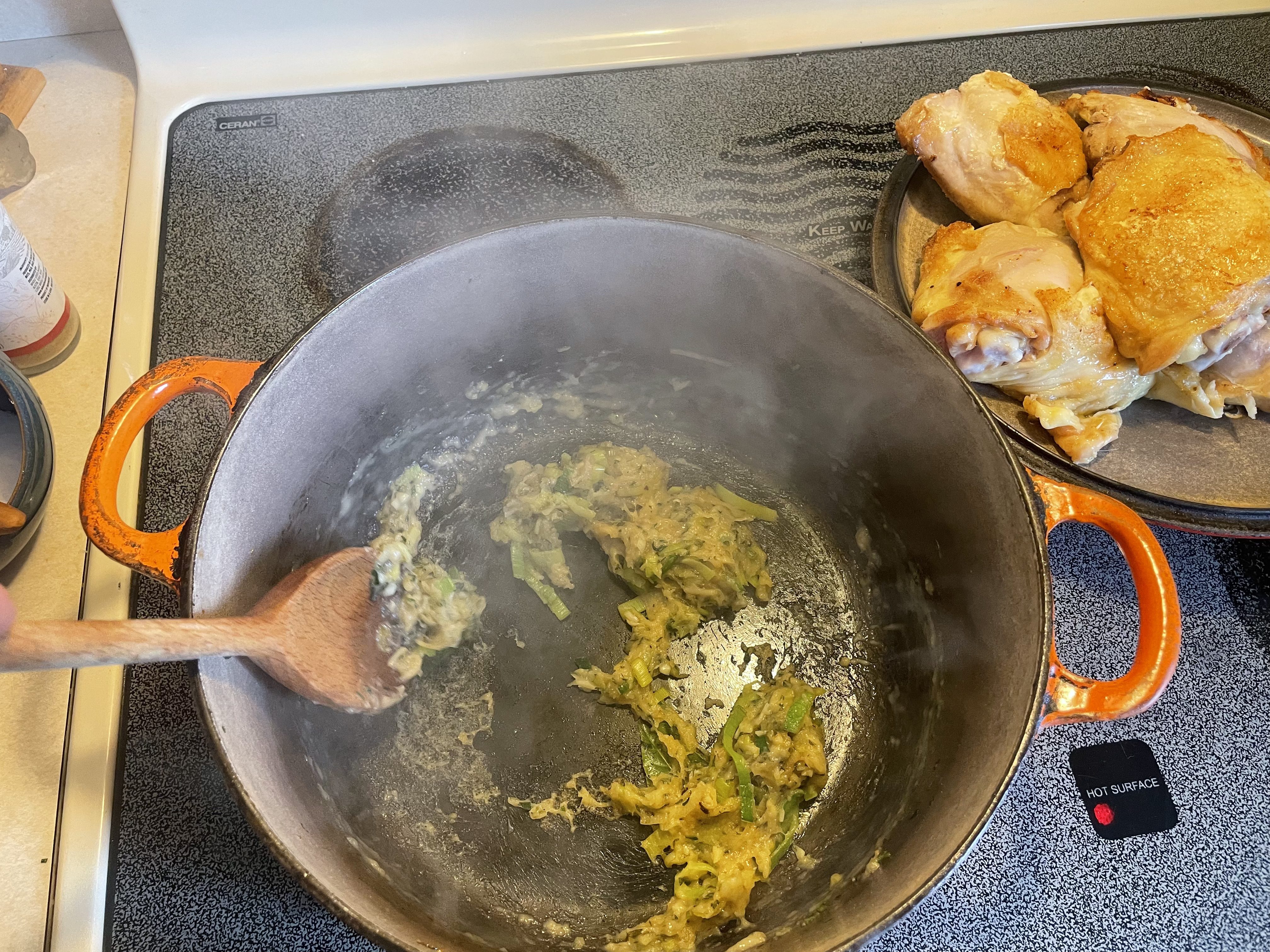 - Using the same Dutch oven, heat up the butter until sizzling and then sauté the thinly sliced leeks for 2 minutes or until soft. Add bay leaves and chopped thyme to the leeks and cook for another minute. Add garlic and flour and stir constantly until you can smell the aroma of both toasted flour and garlic, another 1-2 minutes. Deglaze the pan with sherry, making sure to stir and scrape up any stubborn chicken pieces off the bottom of the pan. And to mix continuously to create a smooth paste of flour with no lumps. Slowly add the chicken broth, stirring to create a creamy, silky mixture.