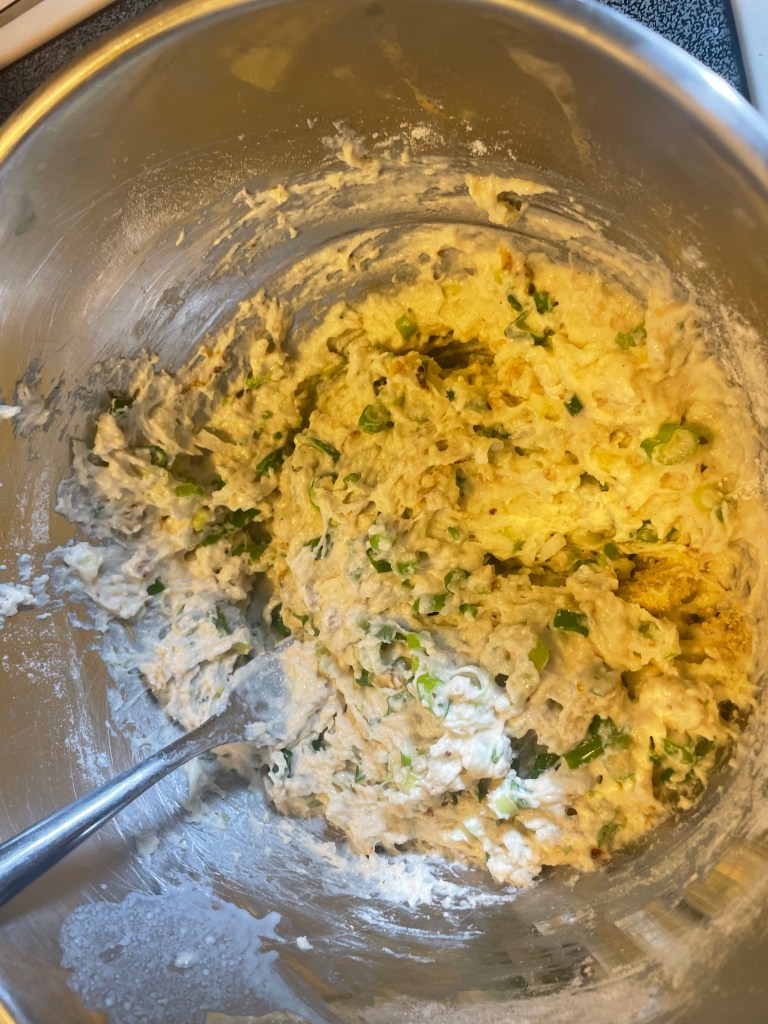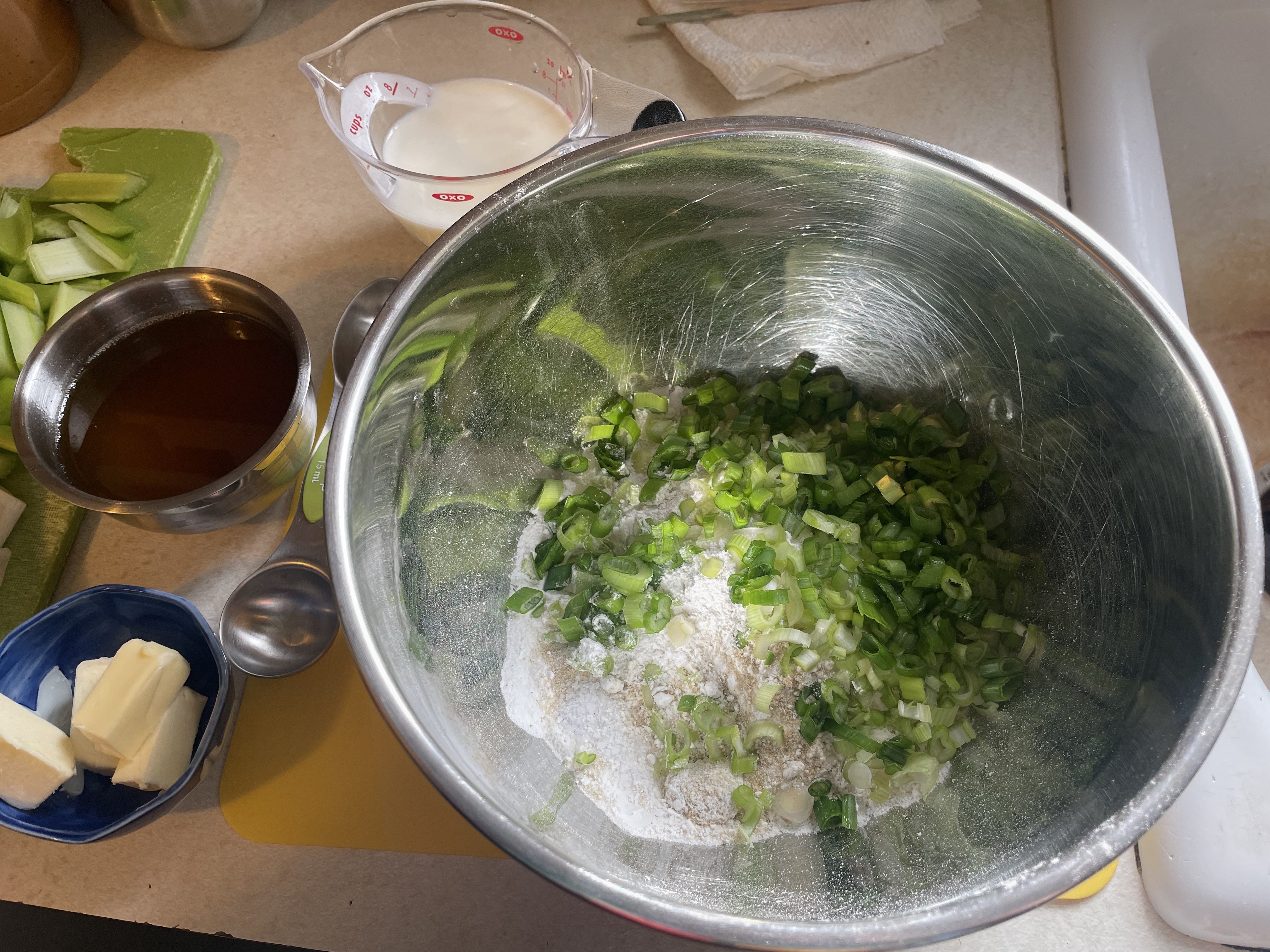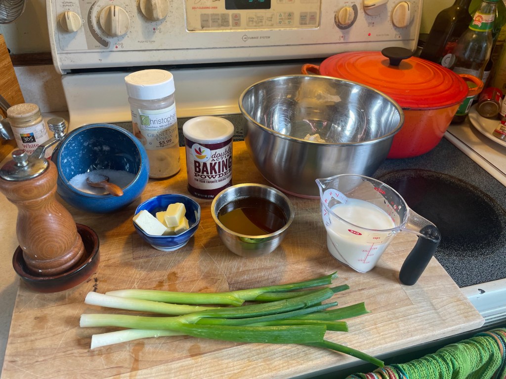 - In a large bowl, whisk together flour, baking powder, onion powder, salt, and pepper. Add the chopped scallions and mix to combine with the dry ingredients.