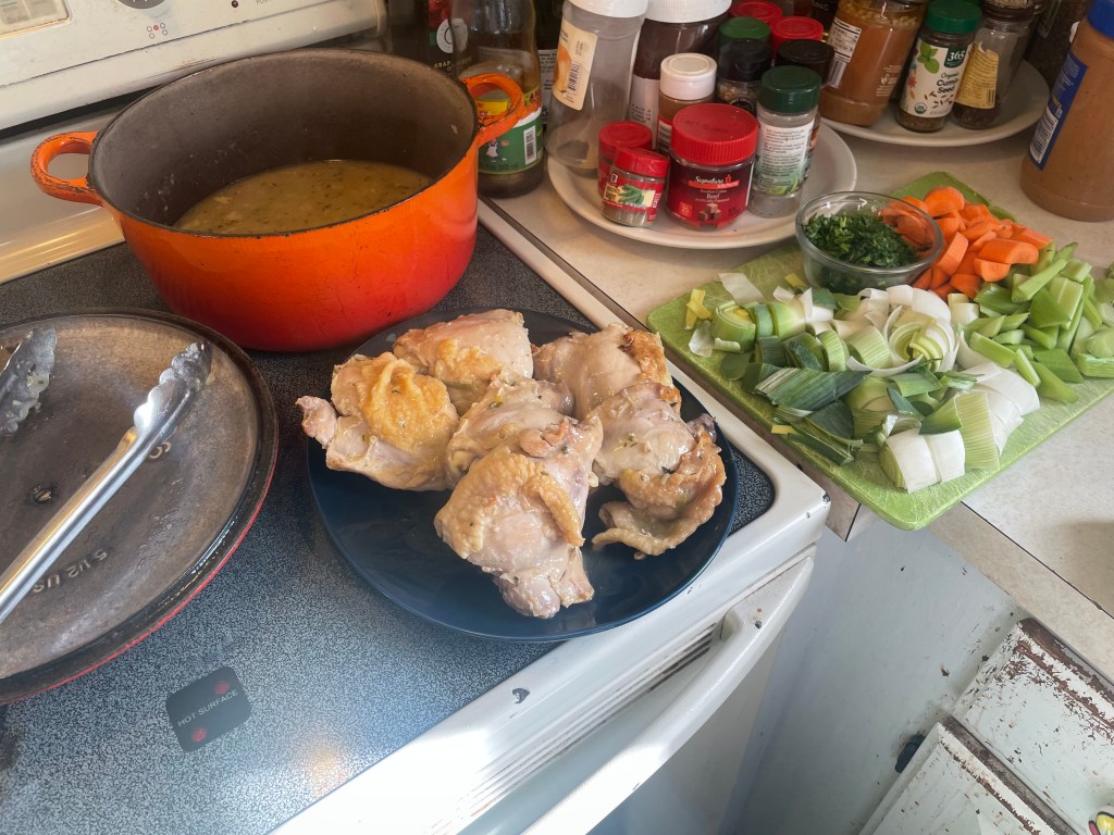 - Remove the chicken thighs from the stew. When cool enough to pick apart safely, remove the meat from the bones and shred into bite-size chunks. Remove the bay leaves from the stew. Return the shredded chicken meat to the pot and check seasoning – add salt and pepper as needed.