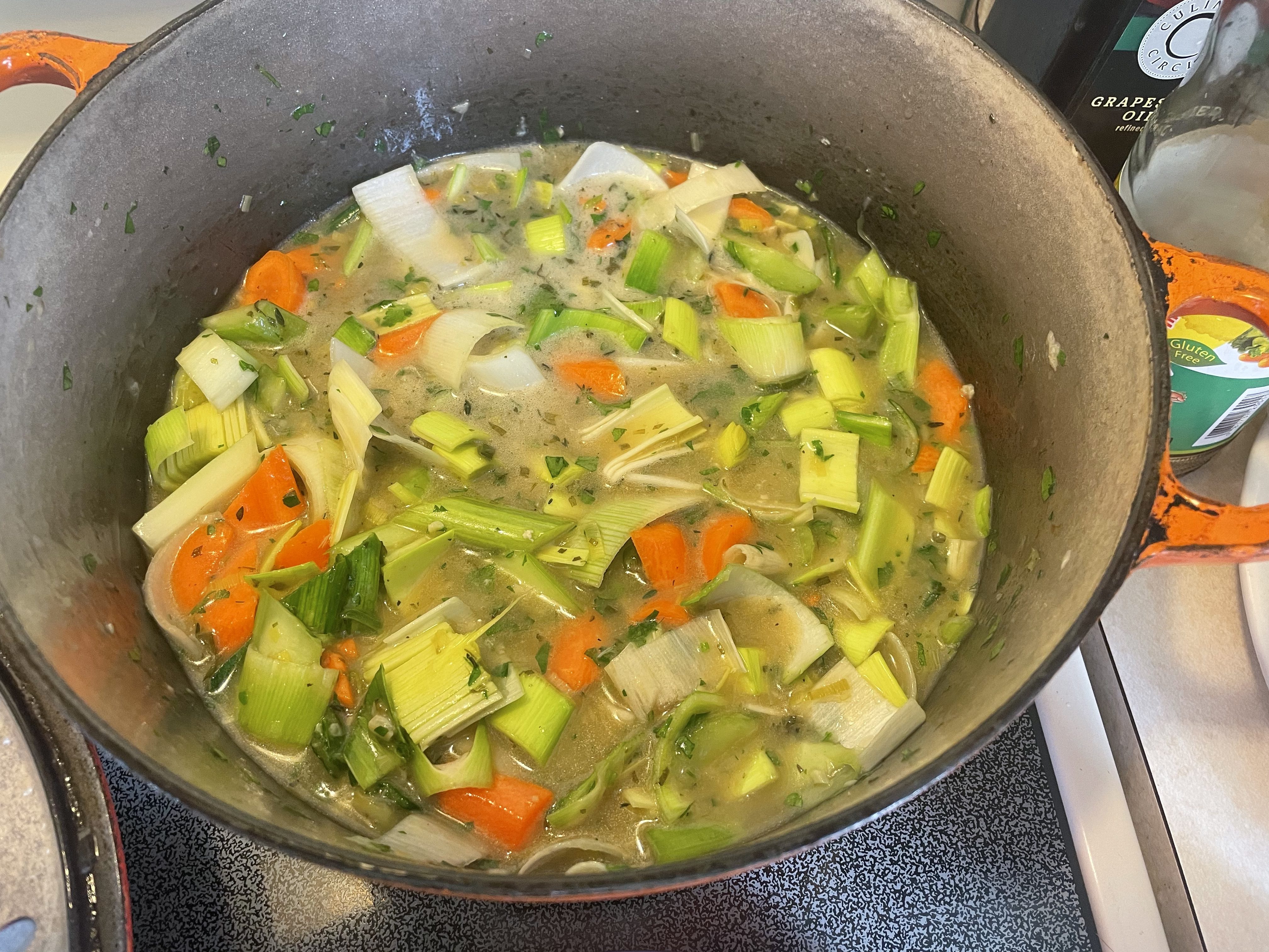 - Add celery, carrots, chunks of leek, tarragon, and most of the parsley to the Dutch oven and stir to combine.