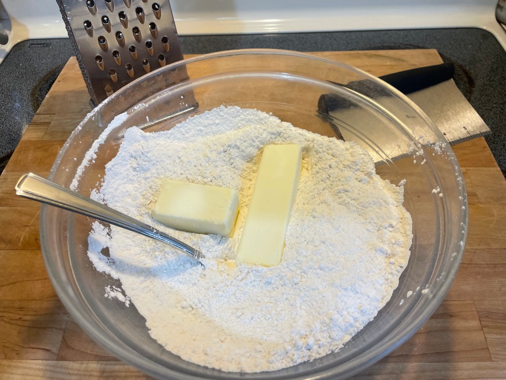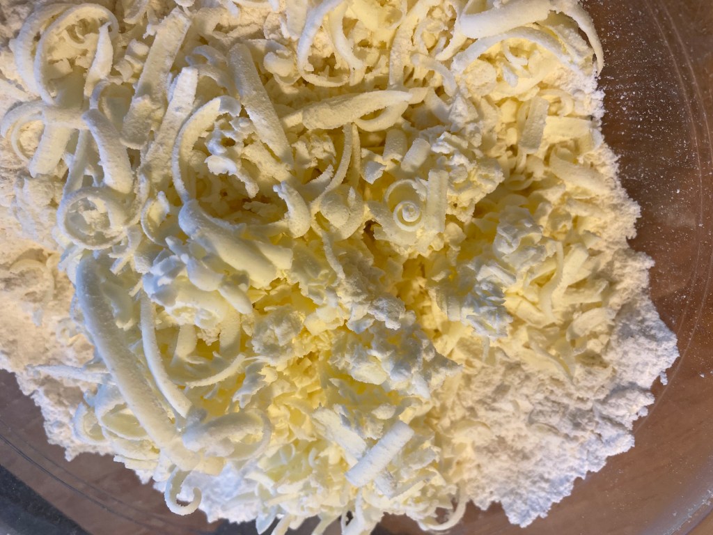 - When the frozen butter block is ready, remove from the freezer and give it a little coating of the flour in the bowl. Then use the large holes on a box grater, grate the butter into creamy swirls over the flour in the bowl. You can also use the grating blade/function on your food processor to complete this step. Toss the grated butter flecks gently through with your flour, sugar, and salt mixture.