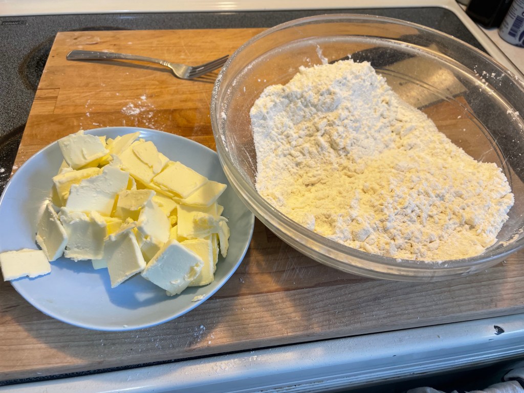 - Place half of the butter (170g/1.5 sticks) in the freezer for at least 30 minutes. Thinly slice the remaining butter and place that in the fridge to keep cold.