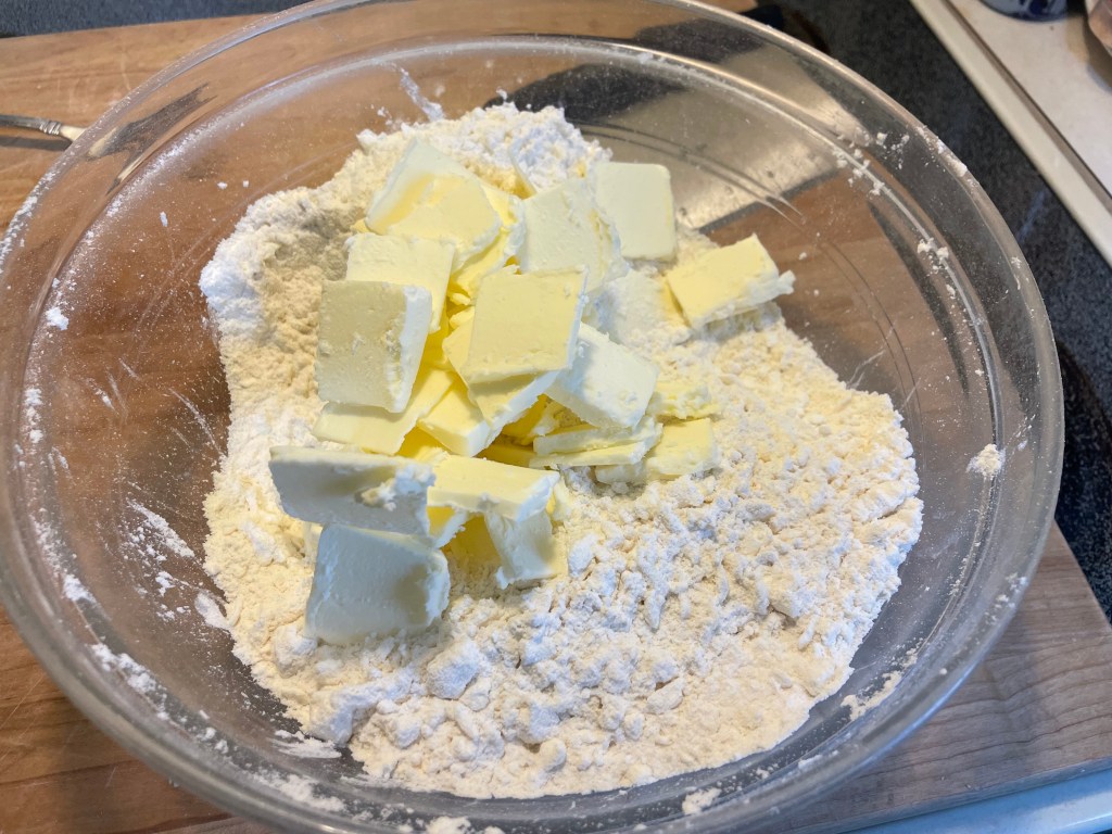 - Add the sliced butter from the fridge into the mixture, tossing to coat in the flour and making sure that all of the butter pieces are separate.