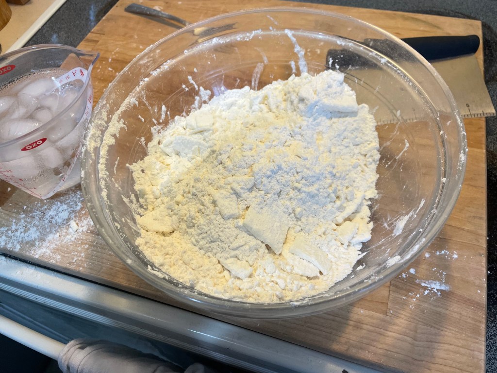 - Start slowly adding ice water to the bowl. Add 120ml/1/2 cup to start, mixing through to hydrate the flour and butter quickly but gently. As pieces of the dough start to come together into briefly cohesive clumps, remove those hydrated portions. Set them aside on a lightly floured work surface. Continue to sprinkle more water on the dry sections of flour remaining in the bowl, gently bringing it together and continuing to remove pieces that roughly hold together.