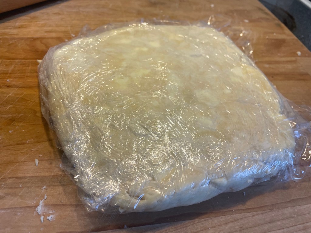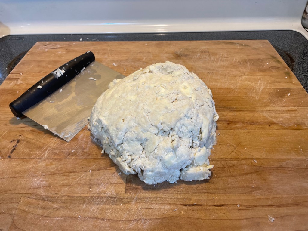 - Once everything is out on the work surface, combine it with some gentle folding and smearing motions, and then use a bench scraper to bring into into a mostly organized mass of dough. Flatten this mass slightly (can use a rolling pin to whack it into gentle submission). Wrap up and allow to rest in the fridge for at least 2 hours.