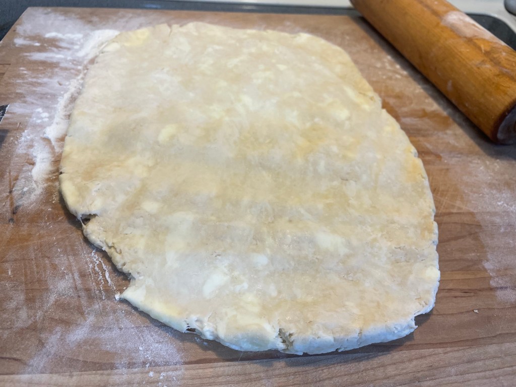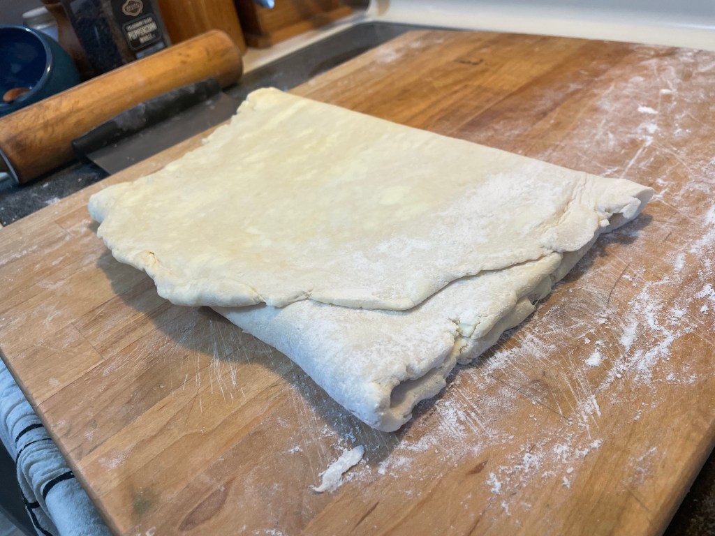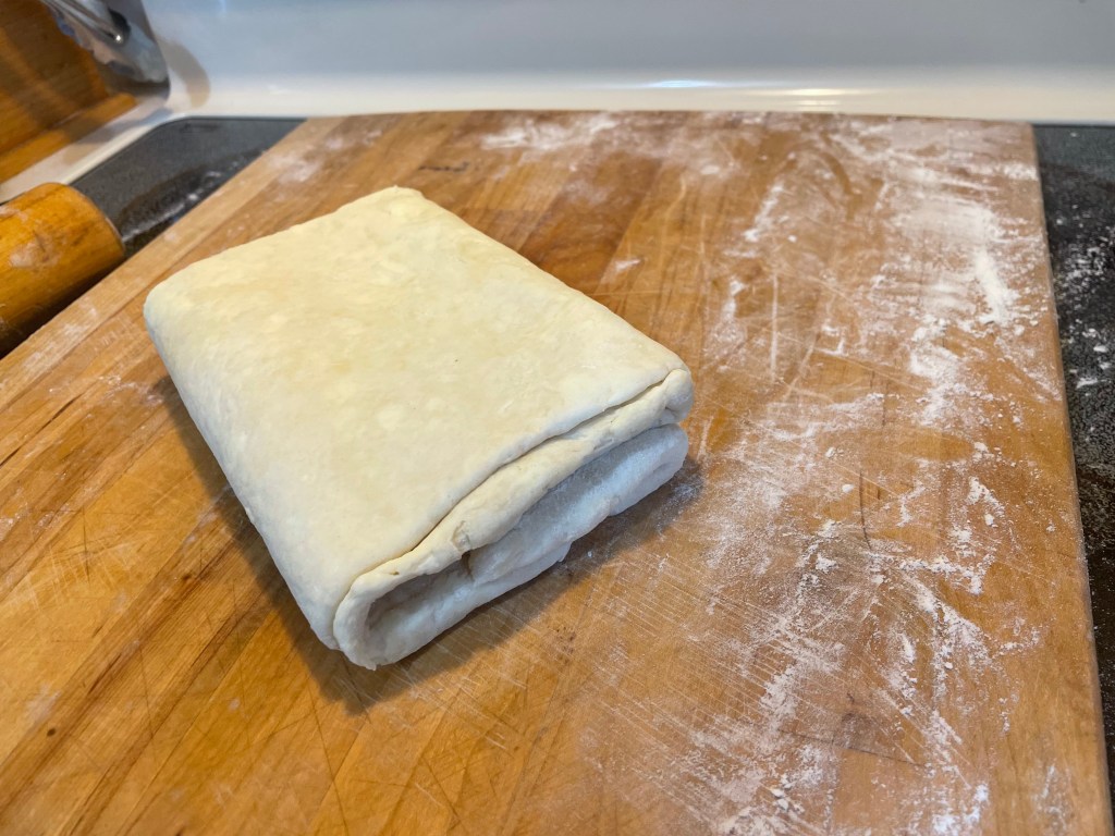 - Sprinkle the dough lightly with flour and roll out to 0.5cm/1/4 inch thick to form a rectangle that is 3 times as long as it is wide. Use your bench scraper as needed to keep the edges trim and neat. Fold the dough into thirds (bottom 1/3 up to the center of the rectangle, then the top 1/3 down over the first fold to get 3 layers.) Turn the dough 90 degrees on your work surface and then repeat rolling and folding one more time. Wrap and return to the fridge until ready to bake. Or divide into two pieces and freeze one or both at this time.