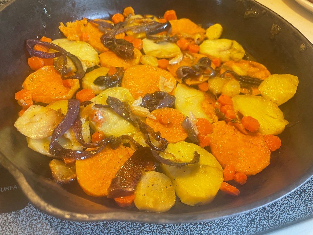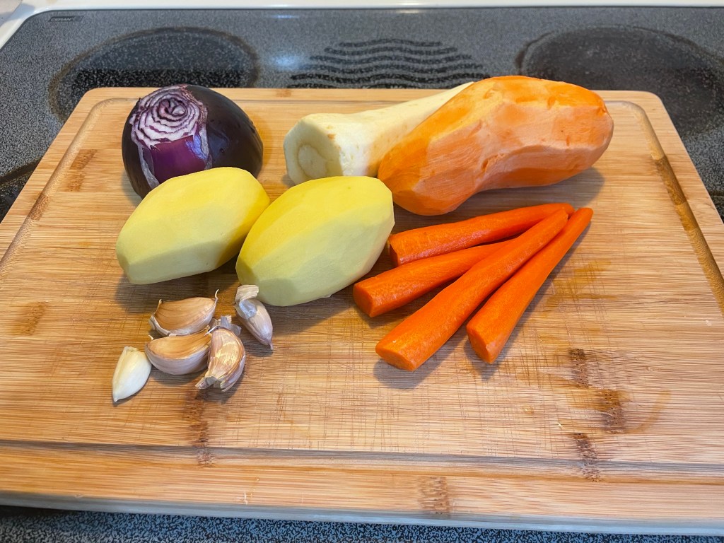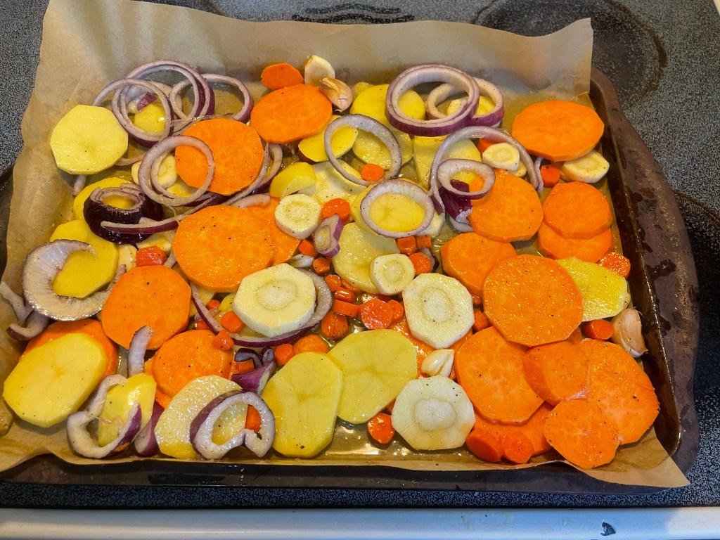 - Line a rimmed baking sheet with parchment paper. Toss potato, sweet potato, carrots, parsnips, onion, and garlic together with olive oil on the baking sheet. Season with salt and pepper. Spread the vegetables out into a single layer as much as possible. Roast until tender and starting to curl with some golden-brown crispness along their edges (30-35 minutes). Remove from the oven and let cool.