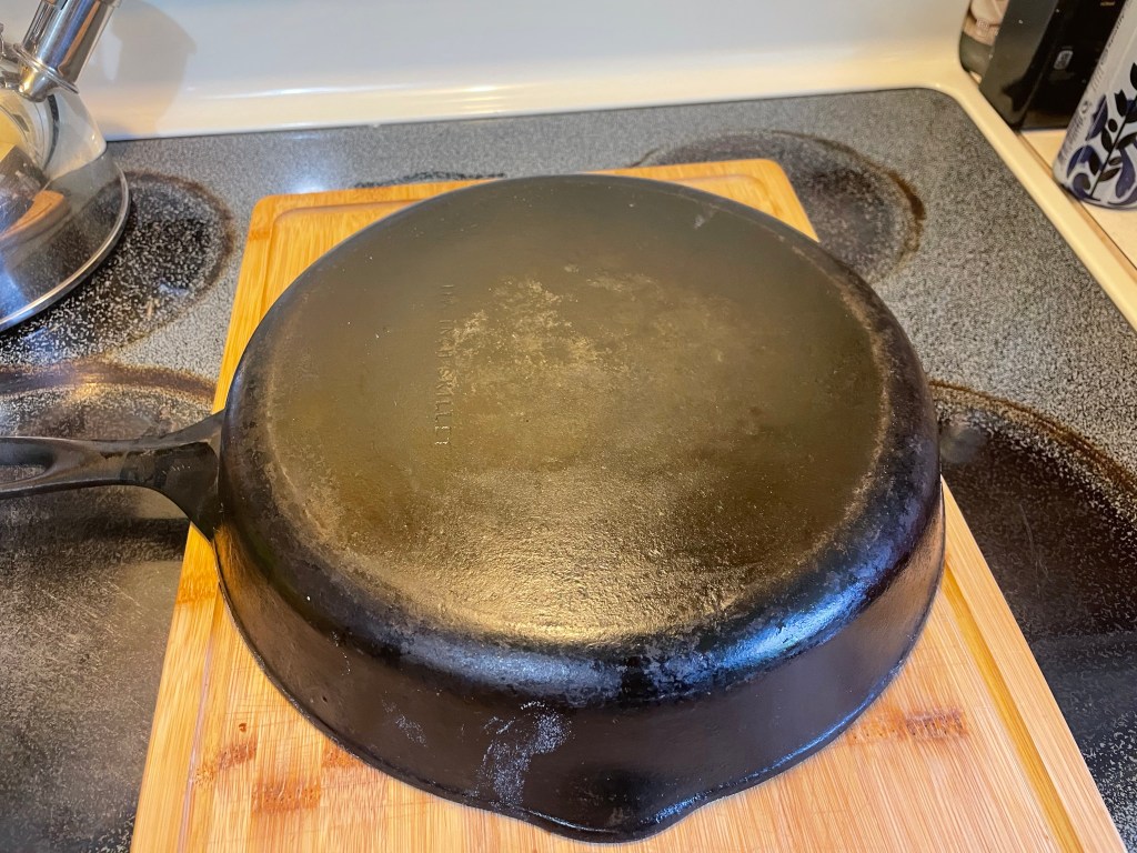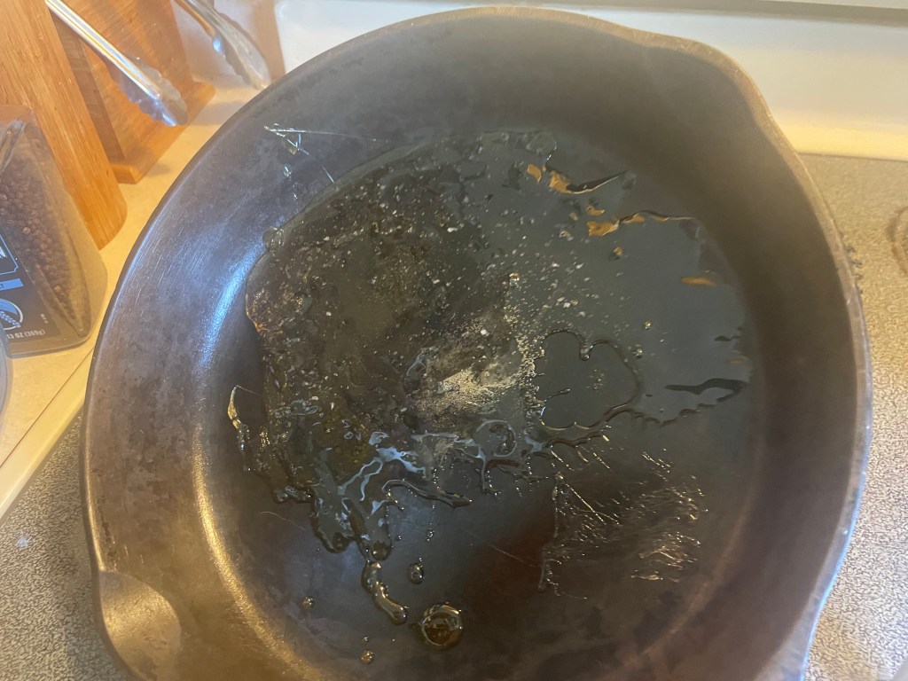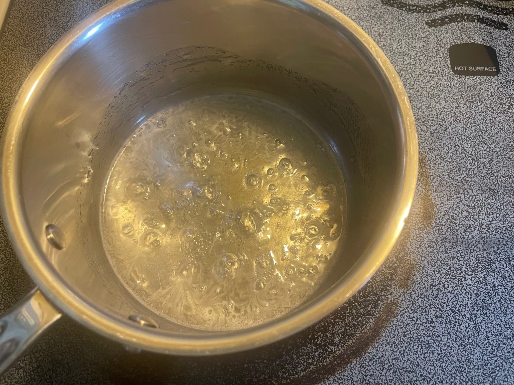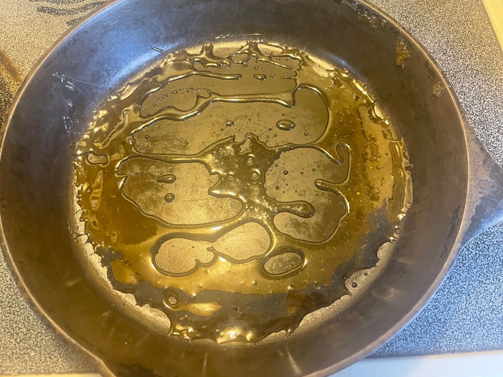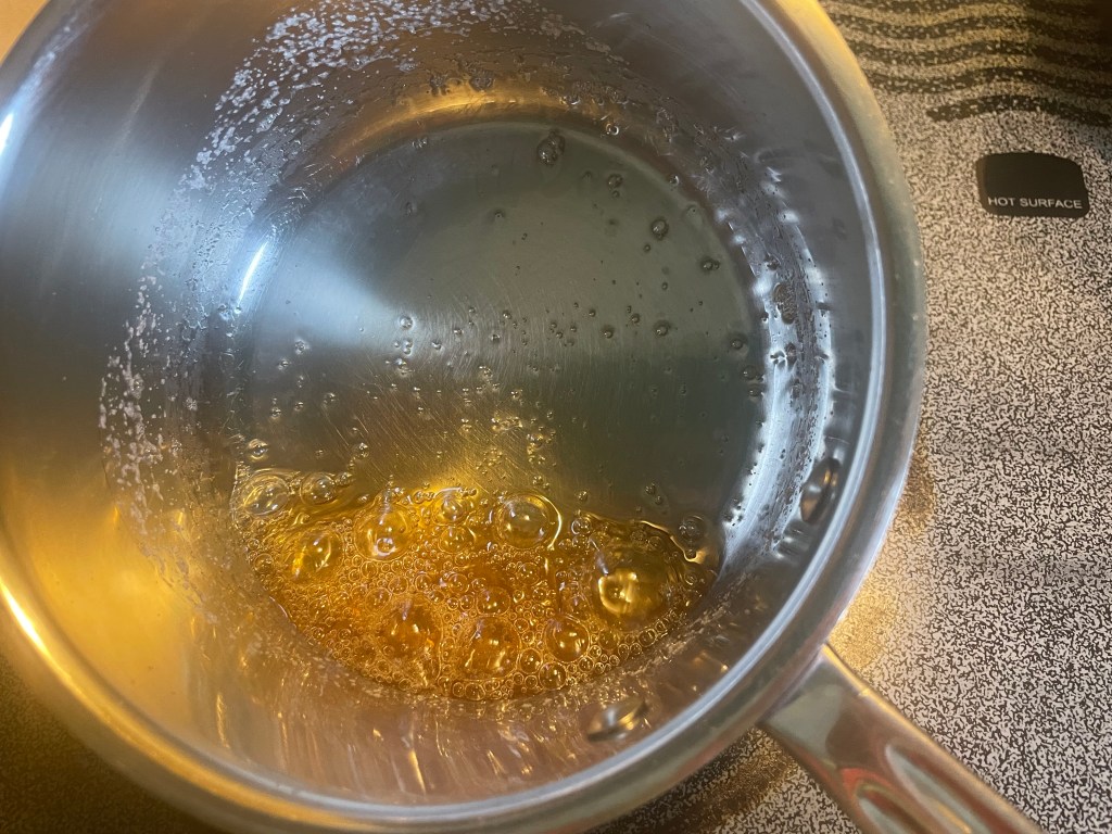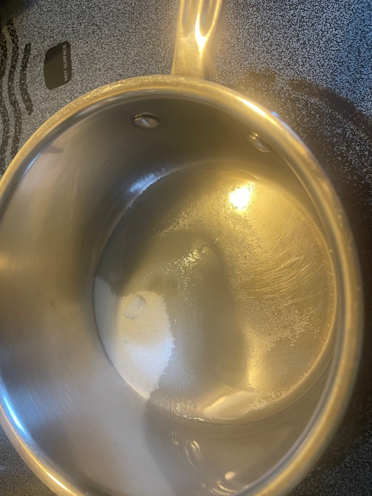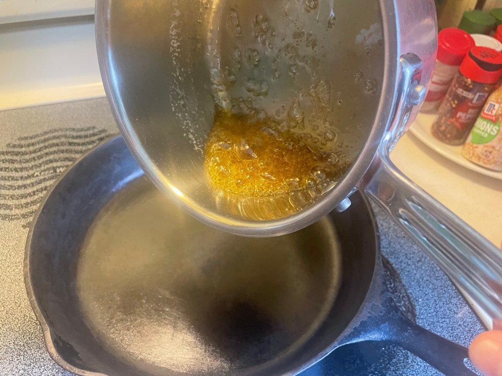 - Place sugar and water in a clean, heavy-bottomed saucepan over medium heat. Swirl occasionally to bring everything together. The mixture will start to bubble energetically. When the bubbling slows and is less audibly fierce, swirl more often and keep a close eye on it. The liquid will turn from clear to caramel fairly quickly once the water has boiled off. Remove from the heat when the mixture is a medium amber color. Add a pinch of salt and the vinegar. It will hiss and try to seize up. Swirl resolutely. Pour the caramel quickly into a 25cm/10 inch diameter cast iron pan or other oven-safe baking dish/pie dish of your choice. You will probably need to place the saucepan and/or the cast iron pan back onto the heat to re-melt the caramel as you swirl, tilt, and rotate to spread it into a thin layer covering the bottom of the cast iron pan. Scatter the chopped herbs over the top of the caramel layer.