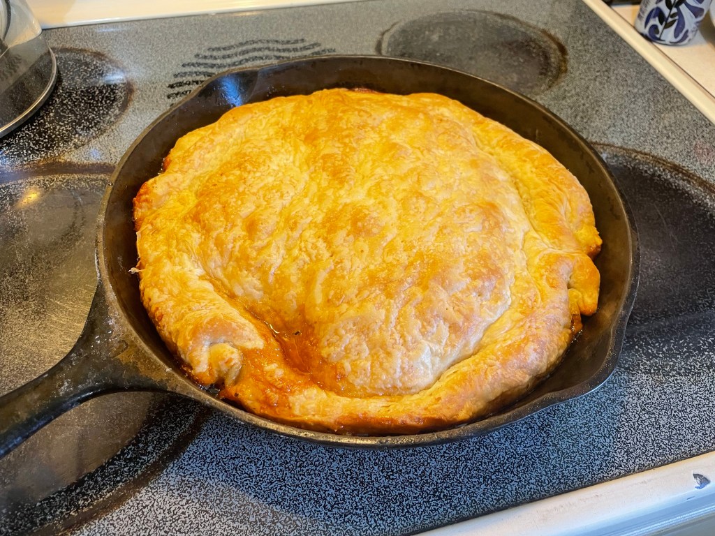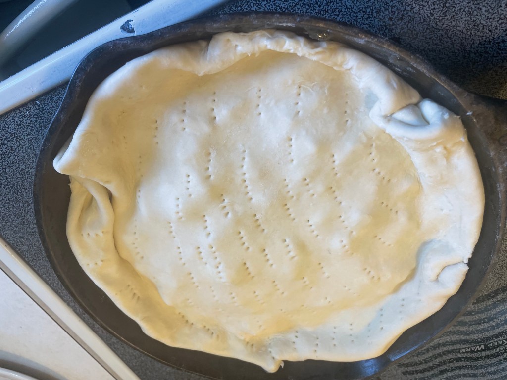 - Roll pastry dough out into a 30cm/12 inch circle and drape over the vegetables and cheese. Tuck any over-hanging pastry edges into the pan, gently nudging them down to cover the filling. Prick the dough all over with a fork.
