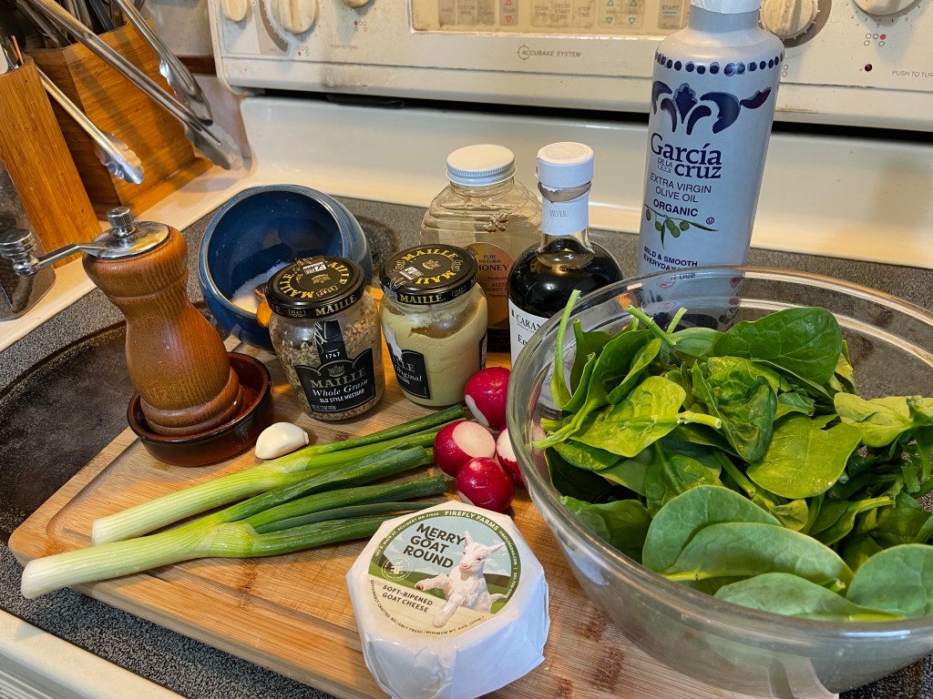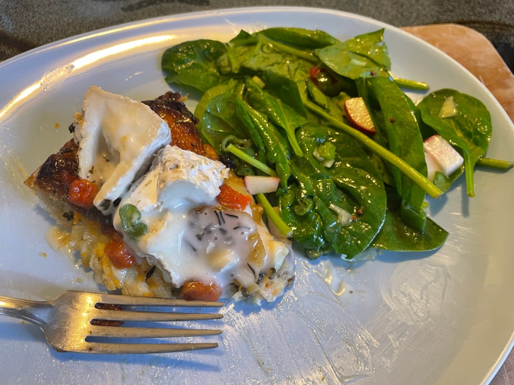 Notes: The Bon Appetit recipe called for 115g/4oz fresh goat cheese crumbled into the tart as the dairy part of the filling. I, to no-one’s surprise, did not find that to be enough cheese. So the amount is doubled here. Also, many of the comments on the original recipe mentioned that the fresh chèvre did not impart enough cheesy flavor. I wanted to serve the tart like Gerta Salibuck did, with creamy white goat cheese on the side. So I substituted more robust and aged cheeses for the tart’s filling. Basically using up cheesy left-overs. Feel free to use whatever you like best for the filling.