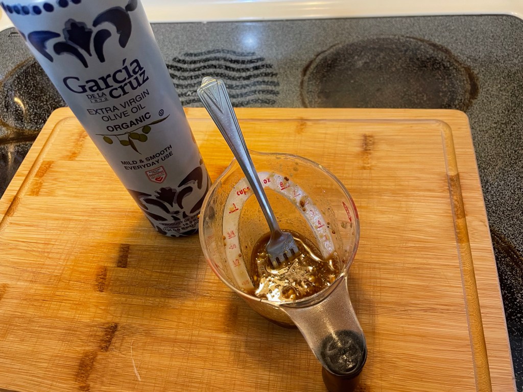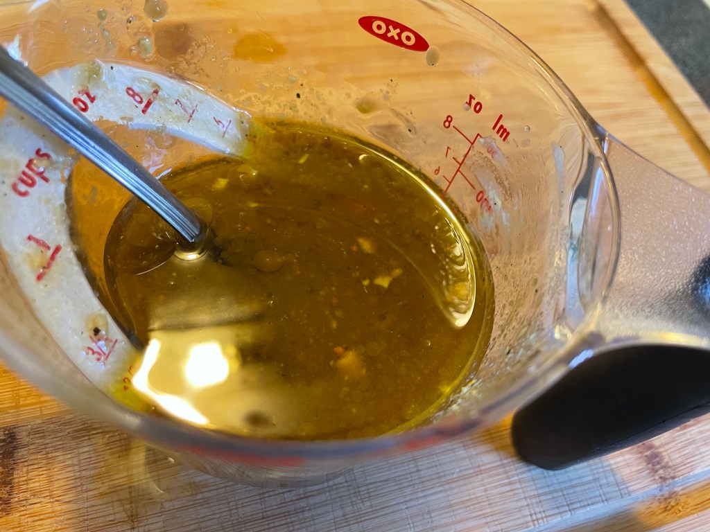 - Drizzle in the oil, whisk in steadily to create an emulsion. Taste and adjust seasonings as needed.