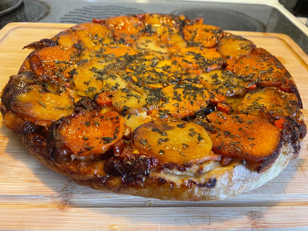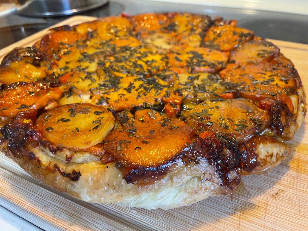 - Arrange your roasted vegetables over the caramel and herbs. This can be done as in the original recipe (bigger slices of potato and sweet potato first, any gaps remaining to be stopped up with little carrot pieces). Or you can follow your organizational or artistic compulsions to layer the vegetables however you choose. Just remember that what is now the bottom layer will be the stunningly caramel-glazed surface of your tart. Squeegee the roasted garlic out of its skin and plop irregularly over the vegetable slices as you go.