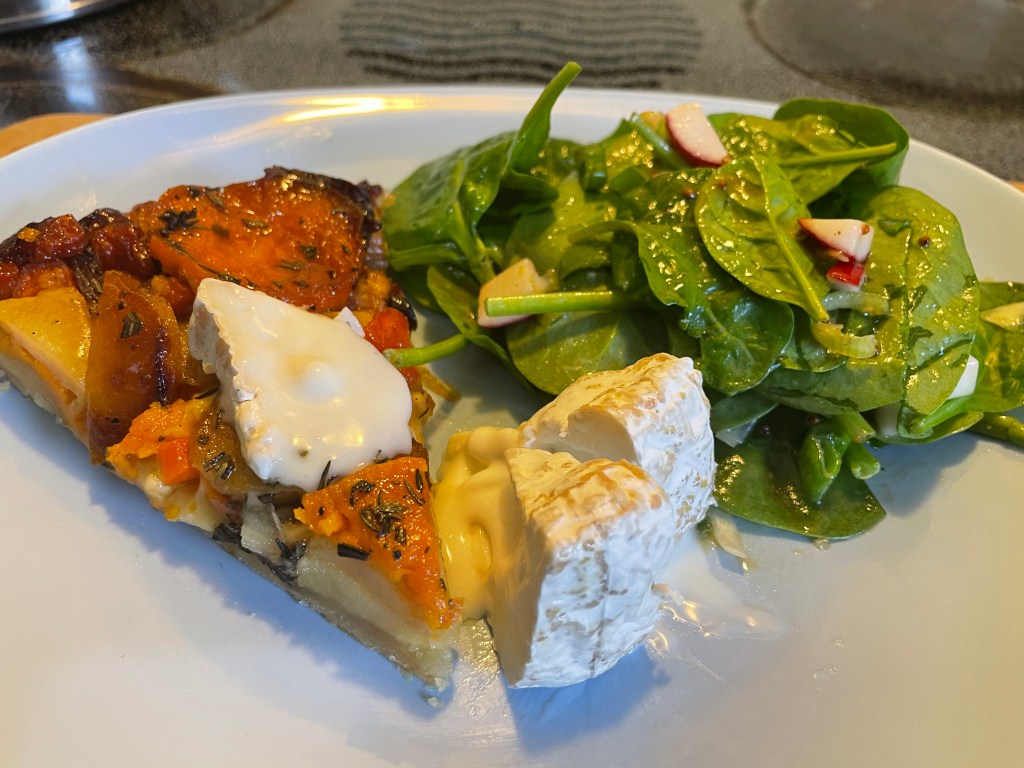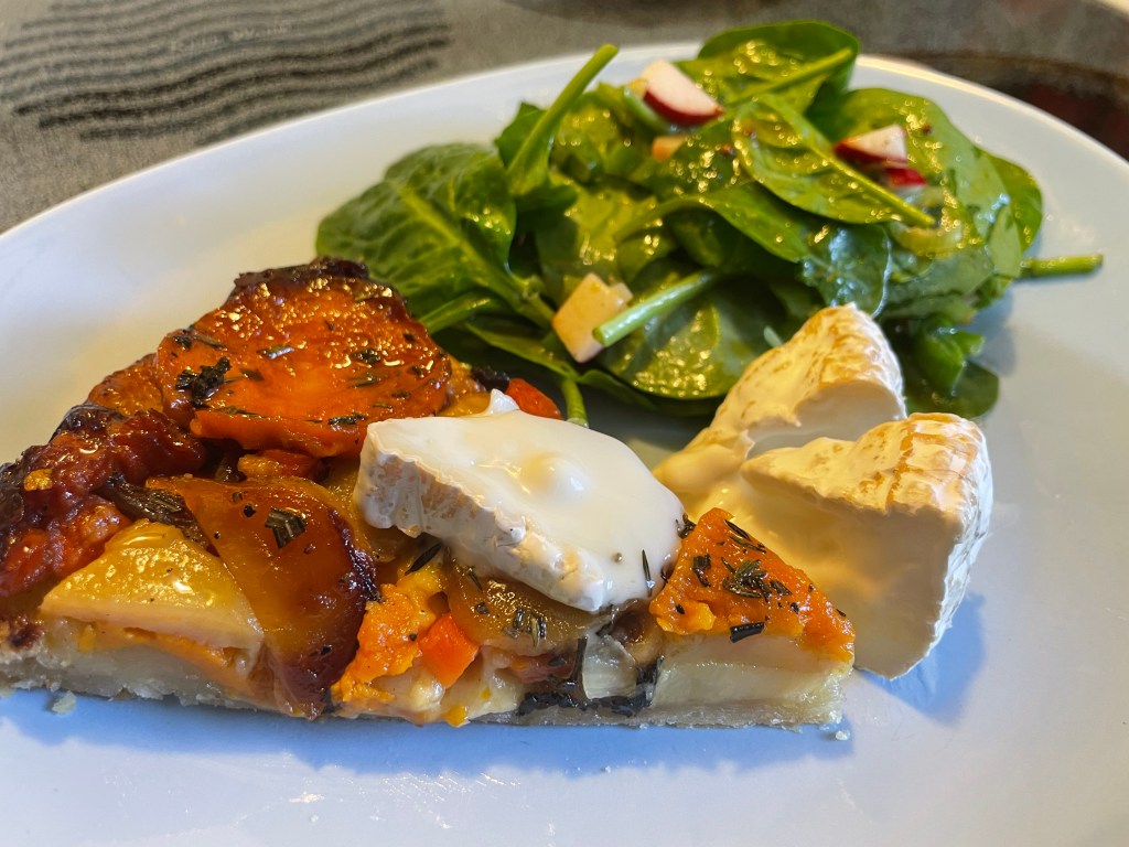 - Allow the tart to cool for 10-15 minutes before carefully inverting onto a platter. Any stubborn vegetables that remain in the pan can be scraped out and arranged back onto the top of the tart. Serve, warm or room-temperature, with wedges of goat cheese and a light green salad.