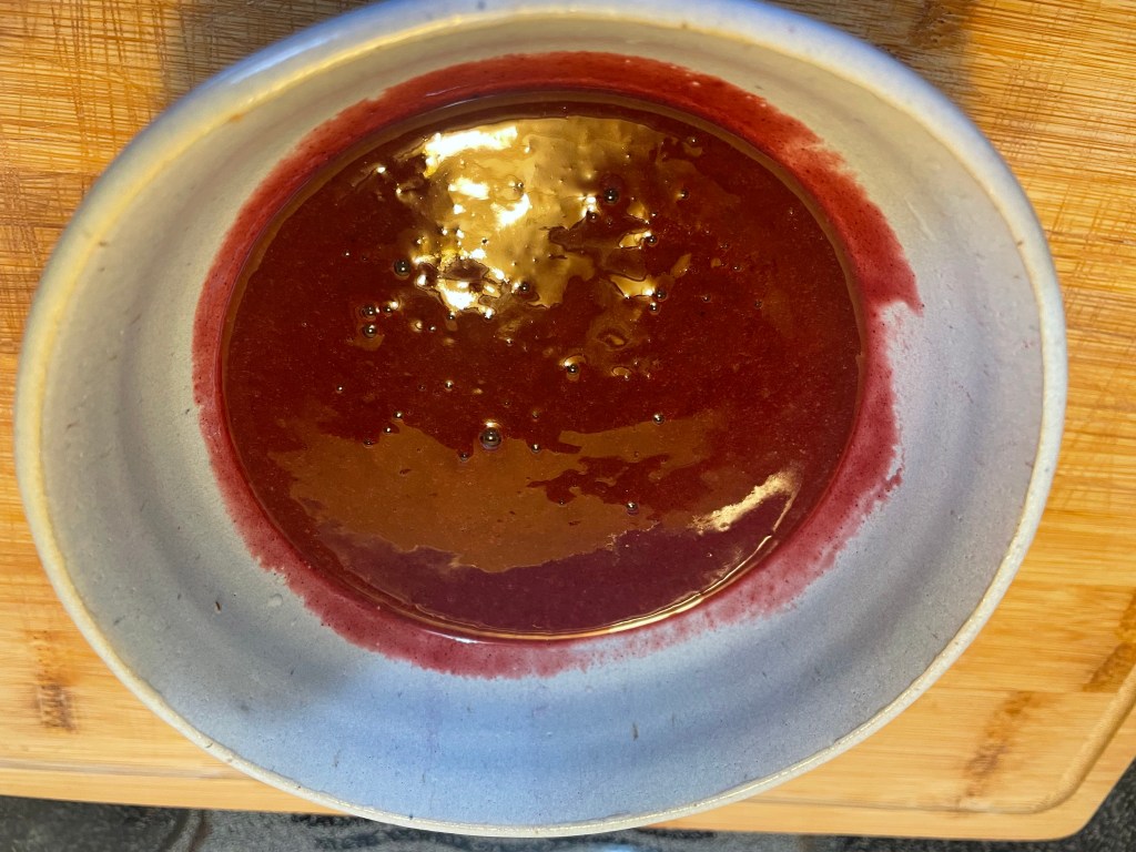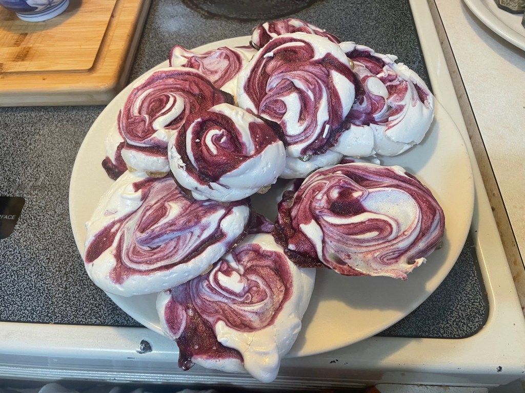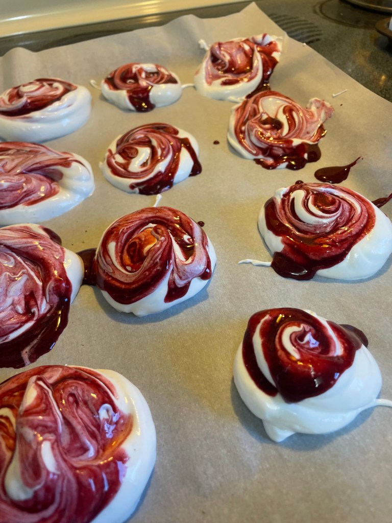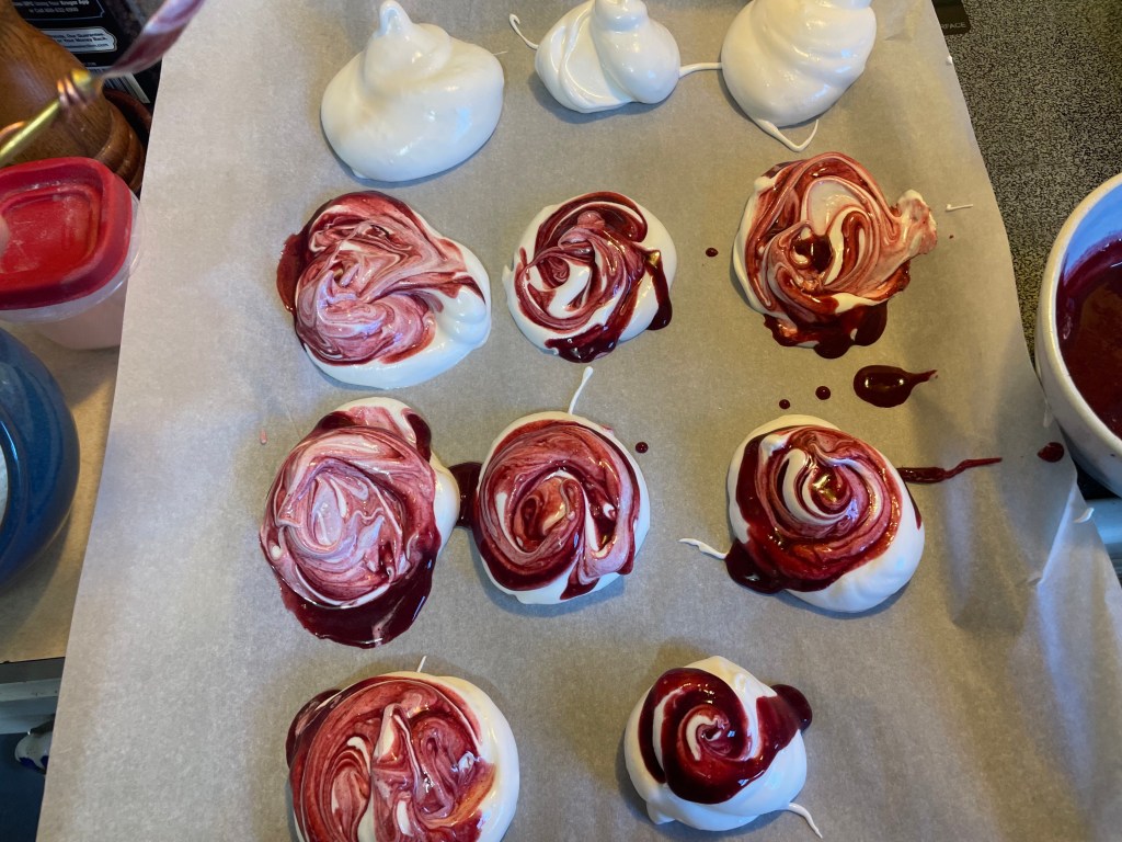 - Get the coulis out of the fridge and gently blob a small spoonful into the top of each meringue mound. I press the top of the meringue in with the spoon, creating a divot, at the same time as I gently pour the berry mix into the depression that I just formed, and then continue the motion to swirl the coulis through the top of the meringue in a satisfyingly gory fashion. I mean, artistically pleasing fashion. The original recipe has you depositing the berry goodness with a spoon first, then using a chopstick or spoon handle to do the swirling. I have found streamlining this down to just spoon-work is easier for me. It’s a victimless crime. Unless you count the sad smears of meringue that you drag back into the coulis bowl with you every time that you re-dip your spoon between meringues. I can live with this.