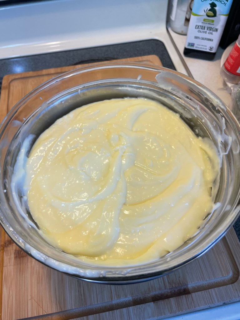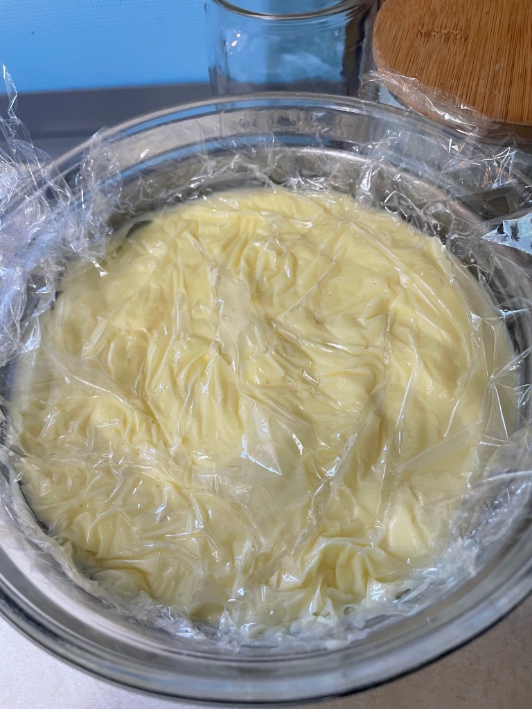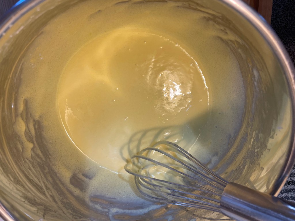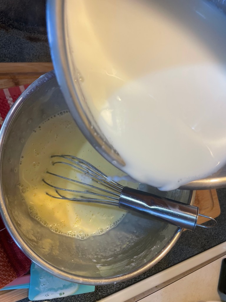 - Gently whisk through your custard until it is loosened (it will need this mixing if you made it earlier and it has been stored it in the fridge).