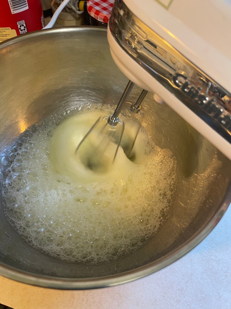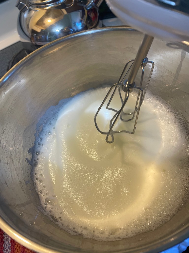 - Whisk the egg whites in a large bowl. This is easiest in a stand mixer but you can also use a handheld mixer with the whisk attachment. The egg white should start to foam and then begin to look like soft clouds.