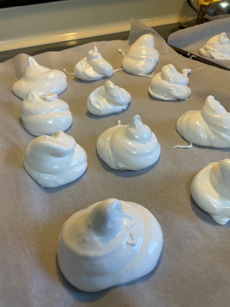 - Depending on the size of meringue you wish to fancifully swirl onto your baking sheet, use either a large soup spoon, 1/2 cup measuring cup, or spatula to scoop portions of meringue and place them on the prepared baking sheet.