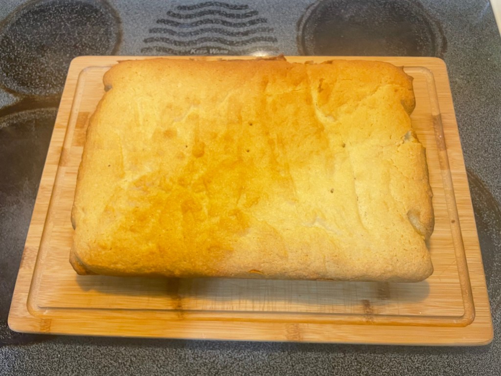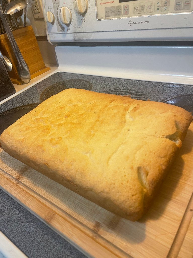 I followed a recipe submitted to food.com by Jenny Sanders, doubling it so that I could use a 9×13 inch/22×30 cm pan and substituting milk for the water in her recipe. It is lovely and moist with a powerful almond flavor.