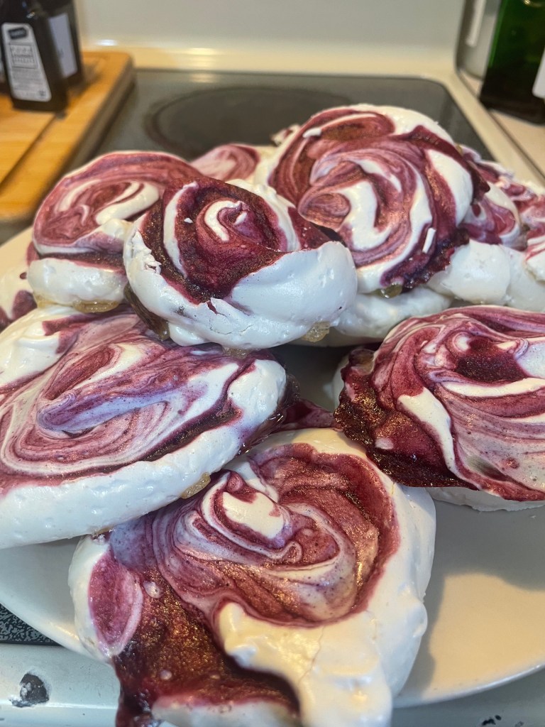 This recipe is from coolfooddude.com and makes 8 large, or 16 small, meringue cookies. Beautifully swirled with crimson. In my rendition, I use a mix of berries because that is what I had the freezer. It results in a darker, more plum-colored coulis. But the tang of the berries is still a lovely contrast to the sweet snowy meringue. This is also really delicious when salted caramel sauce, instead of berry coulis, is swirled into the meringues before baking. Less fruity bite and more buttery, sugary overload.