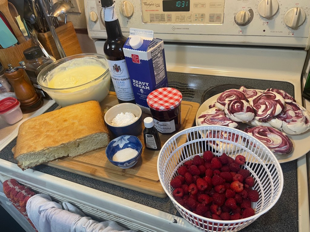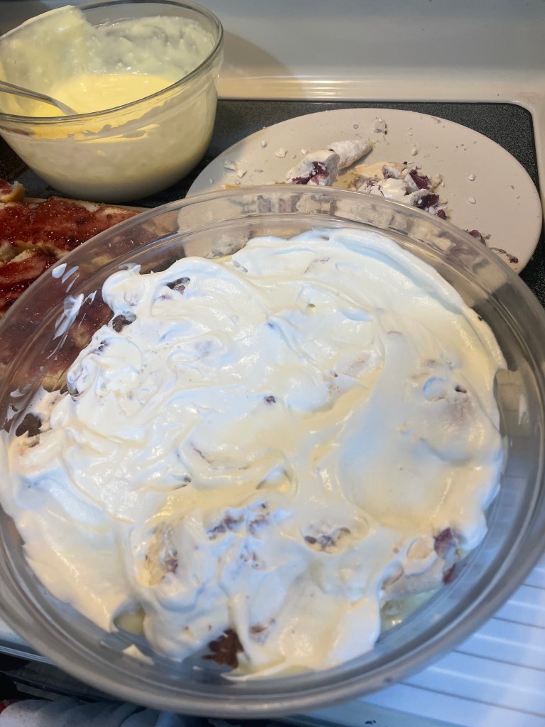 I would probably have been happy to continue tweaking. If not for my rigid, Paladin-like self-control, I would have recklessly continued, taking out the cake component all together and leaving only meringue, whipped cream, and fruit. I guess I am just an Eton Mess kind of girl. But the custard is too good to lose. And custard needs a stronger support than cloud-like cream, the melting kiss of meringue, and juicy fruit. Plus it is not a trifle without some kind of cakey strata. So I left the recipe alone at that point…