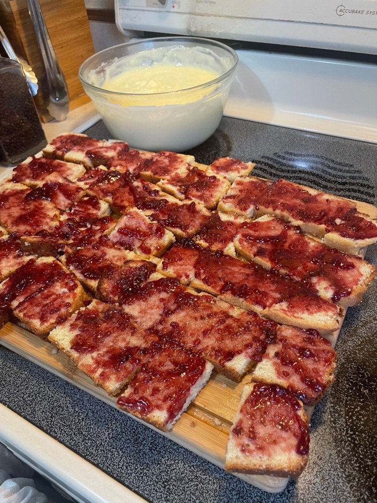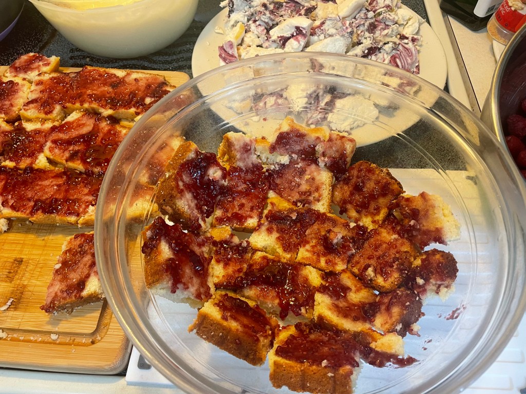 - Arrange your cake squares on a baking sheet and brush them with cream sherry. Then slather them with the raspberry jam. You can also do the sherry brushing and jam anointing before you slice up the cake. Just depends whether you prefer the messiness of slicing a jammy cake or the work of topping each cake square individually. Choices!