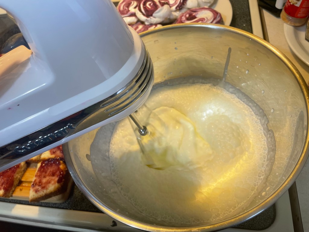 - Combine the heavy whipping cream with the powdered sugar and almond extract and whisk until stiff peaks form. I recommend that you do this with a hand-held or stand mixer.
