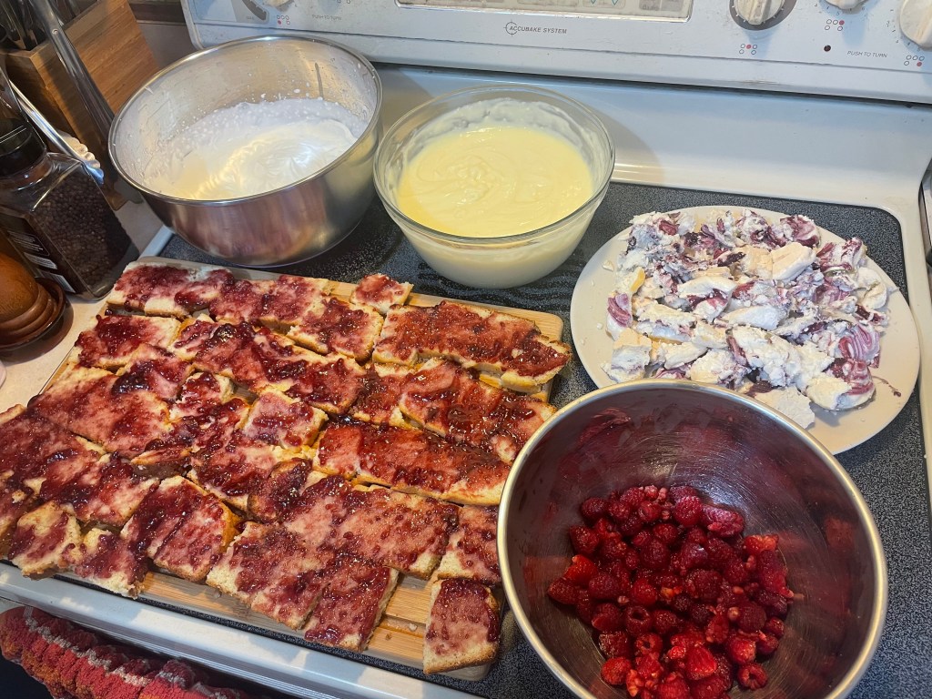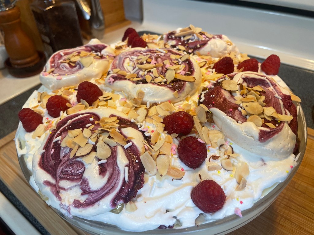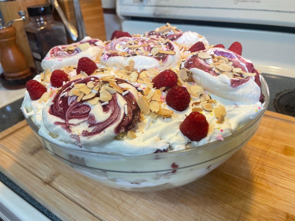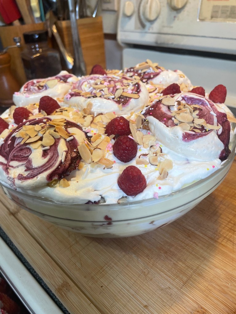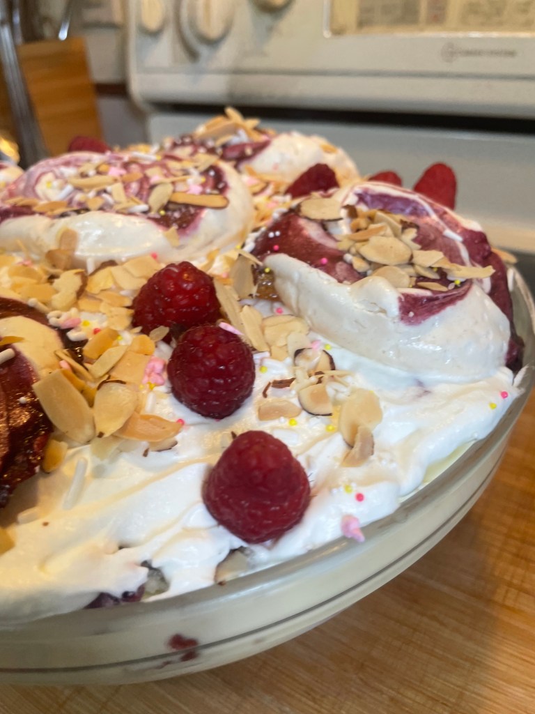 - In a large clear bowl (you want to display all those layers), start by placing 1/3 of the cake squares, jam side up. Layer 1/3 of the macerated fruit on top of the cake, then follow this with 1/3 of the custard, 1/3 of the meringue crumbles, and then 1/3 of the whipped cream. Repeat this layering twice more, ending with a splendid mountain of swirled whipped cream. Decorate with remaining meringue cookies, sprinkle with toasted almond flakes, and top with additional fresh raspberries if desired.