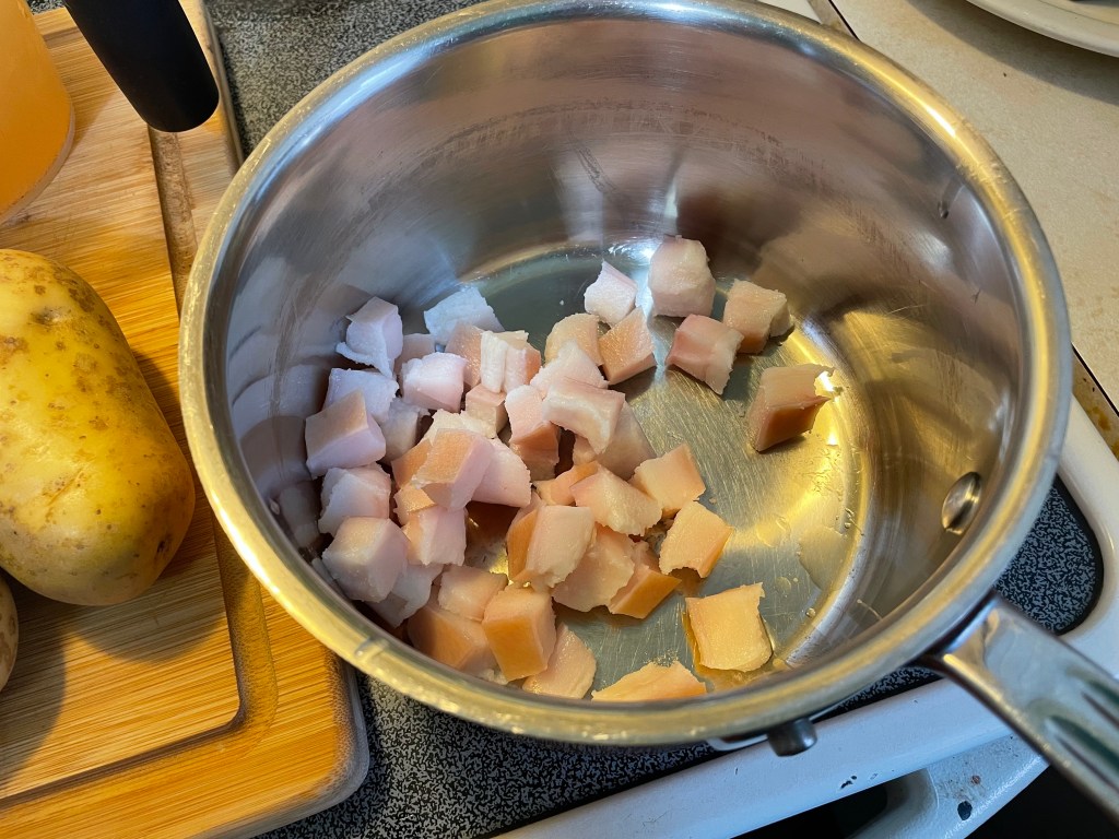 Armed with the clear taste memory of a soup where the dominant flavor was sweet, fresh fish and where, despite the addition of potatoes and dairy, the final result was not at all heavy, I started to research recipes from the area. What I discovered is that most – not all, it will never be all 😉 – cooks and authors decree that the fish to use is haddock. And there is general agreement that a salty, porky base should provide the frying fat for the onions. Finally, potatoes are the only thickening agent; flour is not included. Beyond that, there is only slightly withering disdain aimed at those who insist on making the dish too rich (use milk instead of cream!) or too complicated (no herbs needed, rely on the flavor of the fish!).