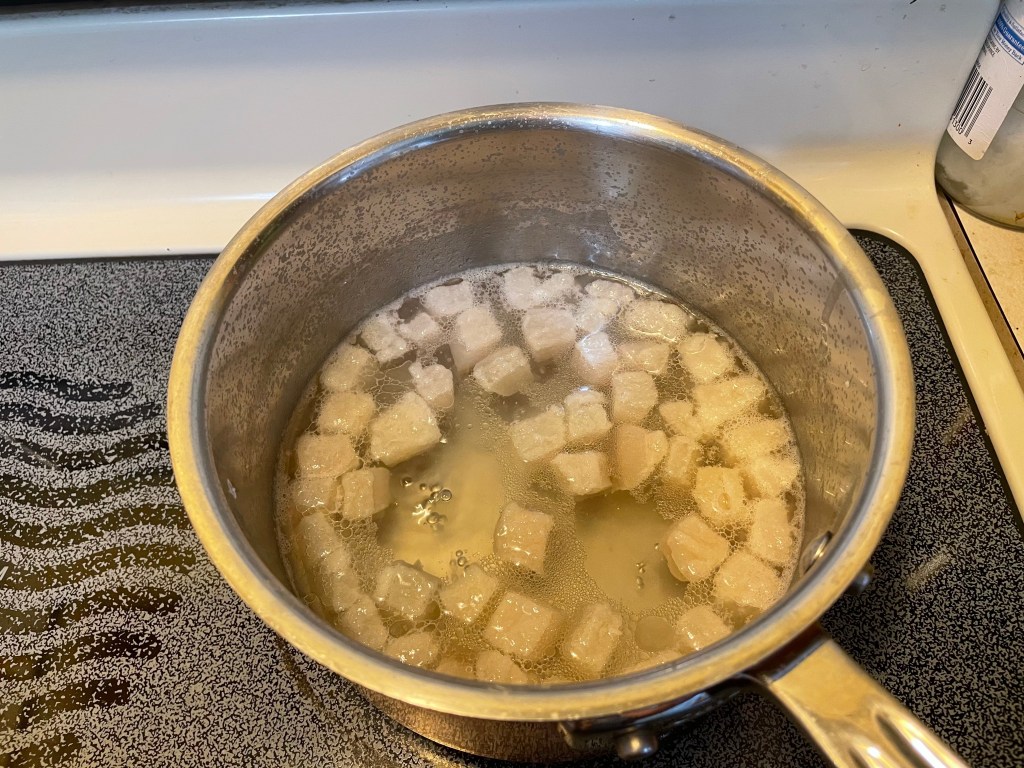 - Place salt pork cubes in a small saucepan, cover with cold water, and bring to a boil over medium-high heat. Lower heat and simmer for 1-2 minutes. Strain, immediately rinse with cold water, and set aside to dry off a little.