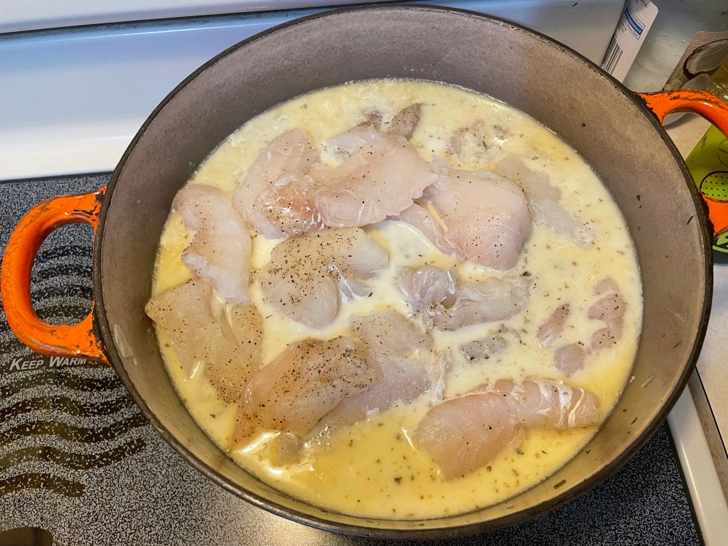 I switched out some of the cream for white wine to obtain a little more acidity and a more nuanced flavor. And snuck in just a tiny bit of thyme, marjoram, and lovage.