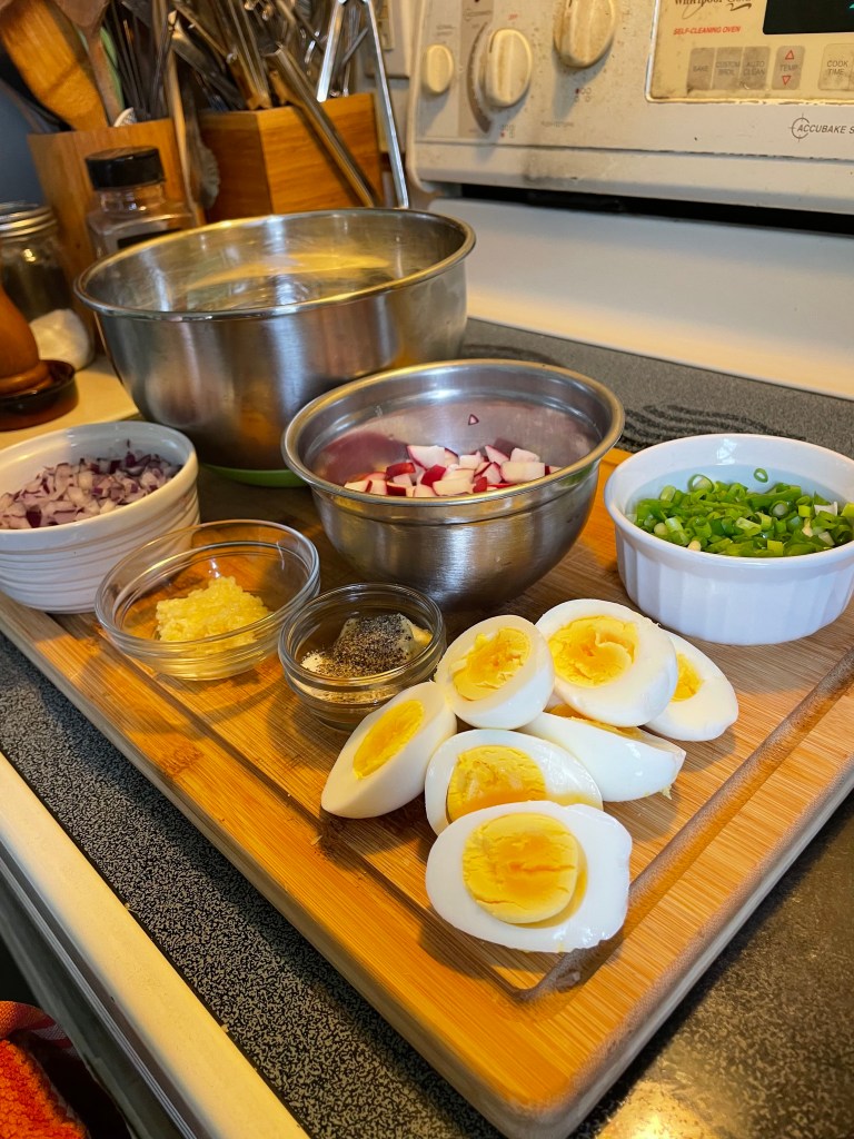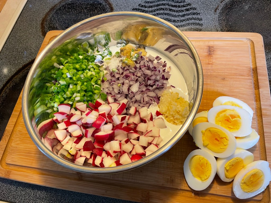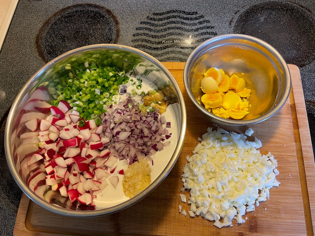 Tangy farmer’s cheese is combined with pungent garlic and onion, the fresh crunch of radishes, and the egginess of eggs. It is even more of a tasty and vibrant recipe when made the day before. So that all of the flavors have time to, ahem, egg each other on to reach their full odiferous potential…