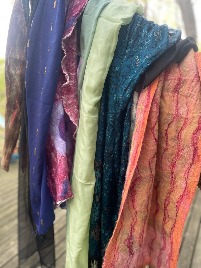 Confirming that we shall all meet again in front of the Font of Wisdom, we enact our plan without delay. I head towards a collection of stalls that specializes in fine fabrics. Colorful swathes of cloth billow out in my air as I stray through this rainbow labyrinth. I have lost sight of the Demaran woman. Peeking through a diaphanous screen of scarves, thinking fondly of Aubray as I brush past beautiful embroidery, I see no one behind me. Thoughtfully, allowing myself only a short moment to admire the scarves, I leave the market.